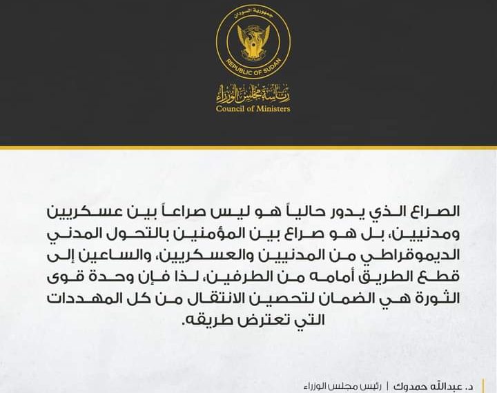 إن الصراع الدائر حالياً هو ليس صراعاً بين عسكريين ومدنيين، بل هو صراع بين المؤمنين بالتحول المدني الديموقراطي من المدنيين والعسكريين، والساعين إلى قطع الطريق أمامه من الطرفين، لذا فإن وحدة قوى الثورة هي الضمان لتحصين الانتقال من كل المهددات التي تعترض طريقه.