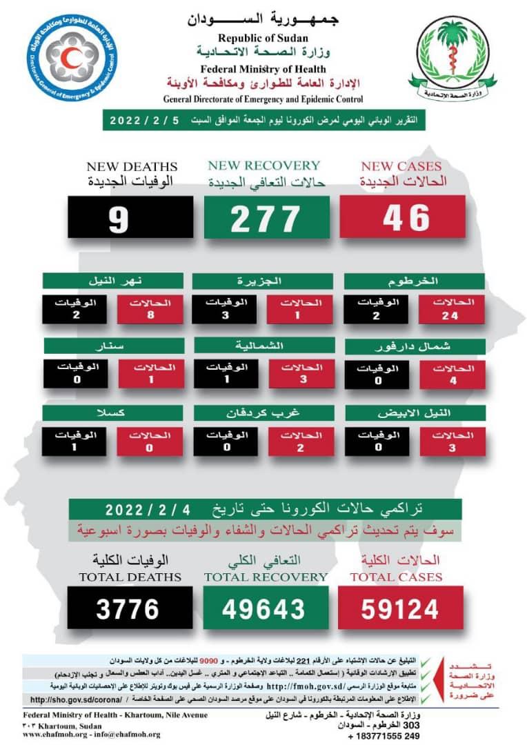 (46) حالة إصابة جديدة بـ”كورونا” ، و(277) حالة تعافي ، و(9) وفيات، بحسب التقرير الوبائي اليومي لوزارة الصحة السودانية ليوم أمس (السبت).