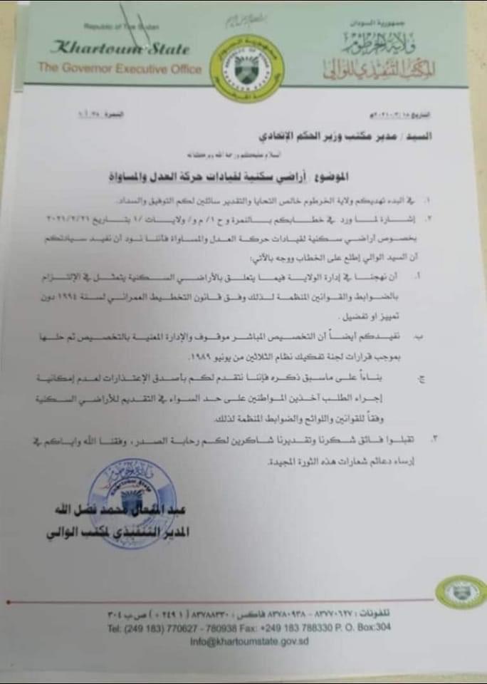 رفضت ولاية الخرطوم، طلب حركة العدل والمساواة بشأن حصولها على اراضي سكنية بالولاية.وذكر بيان ممهور من المدير التنفيذي لمكتب الوالي عبدالمتعال محمد ، ان التخصيص المباشر للأراضي السكنية موقوف وان الادارة المعنية به تم حلها بموجب قرارات لجنة ازالة التمكين.واكد البيان، ان نهج ادارة الولاية فيما يتعلق بالأراضي السكنية يتمثل في الالتزام بالضوابط والقوانين المنظمة، دون تمييز أو تفضيل، وفق قانون التخطيط العمراني لسنة 1994.وتقدم مكتب الوالي بالاعتذار لعدم امكانية اجراء الطلب، لجهة انه اخذ في المواطنين على حد السواء في التقديم للأراضي السكنية بحسب اللوائح والضوابط المنظمة لذلك.