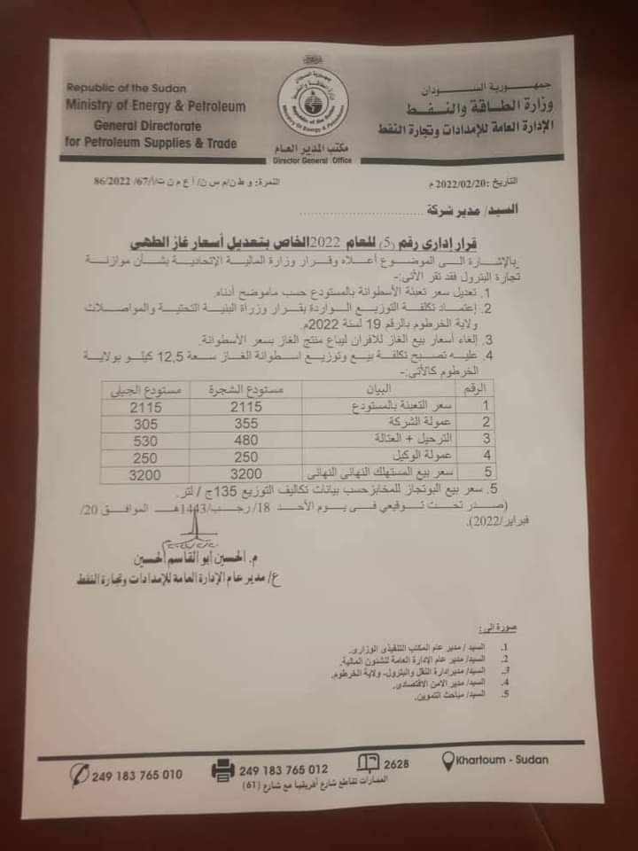 تفأجا المواطنين بزيادات كبيرة وخاصة لاسعار الغاز بالسودان فقد وصل سعرها ل 3200 جنيه للأسطوانة من المستودع.. وتذمر واسع من المواطنين جراء هذه الزيادة الكبيرة والتي اتت .متزامنة مع زيادات الكهرباء. ومطالبت بالاعتصام امام وزارة الطاقة.