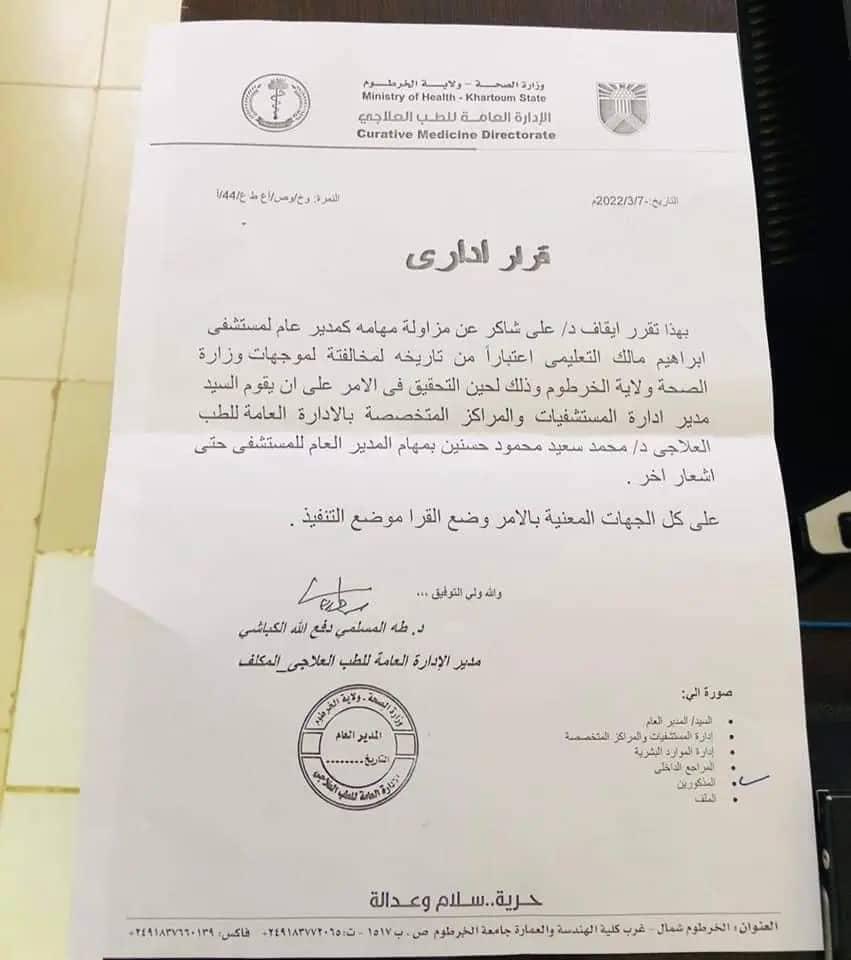 اصدرت وزارة الصحة ولاية الخرطوم قرار بإيقاف د. علي شاكر من مزاولة مهامه كمدير مستشفى إبراهيم مالك التعليمي واخضاعه للتحقيق لمخالفته موجهات الوزارة .