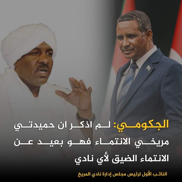 مؤكدا ان حميدتي ظلت اياديه ممدودة بيضاء من غير سوء لكل المناحي الوطنية وقد شاهدناه داعما ومساندا لمجمل القضايا ذات الطابع الاجتماعي وكذلك الرياضي و هو الذي سبق وأن دعم نادي الوادي نيالا و نادي الأهلي مروي وبالتالي فإن دعمه لنادي المريخ يصب في صالح الكرة السودانية ونهضتها وتطورها بعد ان فقدت ميزة اللعب الدولي بسبب عدم مطابقة استاداتها لشروط الاتحاد الافريقي لكرة القدم وهي الأسباب التي حرمت نادي المريخ والمنتخب من اللعب داخليا.