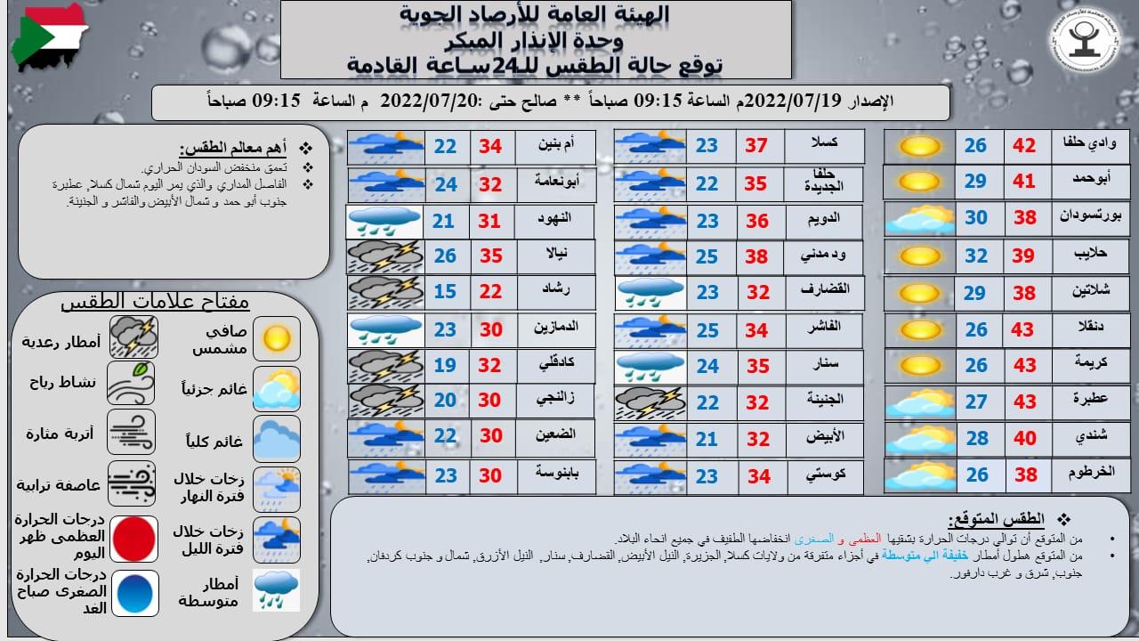 توقعت الهيئة العامة للأرصاد الجوية انخفاض درجات الحرارة بشقيها العظمي والصغرى، انخفاضا طفيفا في جميع انحاء البلاد،.وتوقعت هيئة الأرصاد هطول أمطار خفيفة إلى متوسطة في أجزاء متفرقة من ولايات : كسلا ،القضارف، سنار، الجزيرة، النيل الأبيض، النيل الازرق، شمال وجنوب كردفان، شرق وجنوب وغرب دارفور ، وسجلت أعلى درجة حرارة بالبلاد 43 درجة في مدينة عطبرة ، وأدنى درجة حرارة بالبلاد ليوم أمس 15 درجة في مدينة رشاد ، أعلى درجة حرارة متوقعة لهذا اليوم 43 درجة في كل من مدينة عطبرة ، دنقلا وكريمة ،وأدناها 15 درجة في مدينة رشاد ، موقف الأمطار حتى الثلاثاء : الجنينة : 2.0 ملم ، الأبيض : 0.5 ملم ، أبونعامة : 4.4 ملم ، رشاد : 63.4 ملم ، الدمازين: خفيفة ، كادقلي: 45.7 ملم.