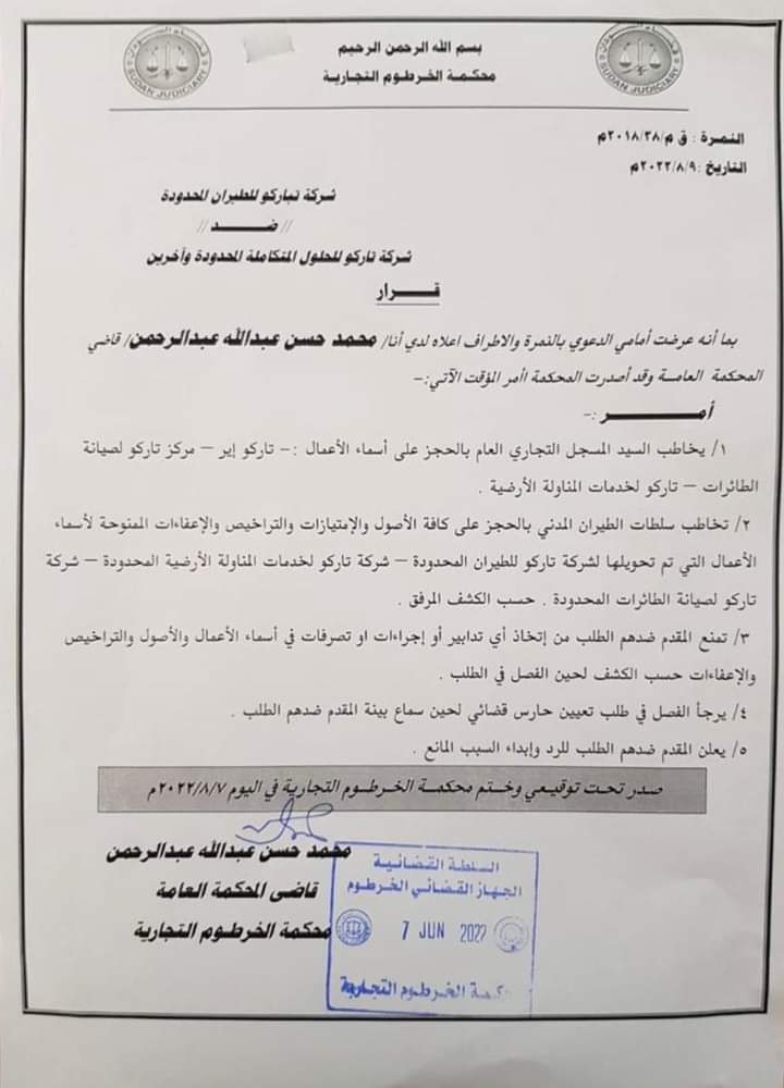 قرار قضائي بالحجز علي اصول شركه تاركو للطيران