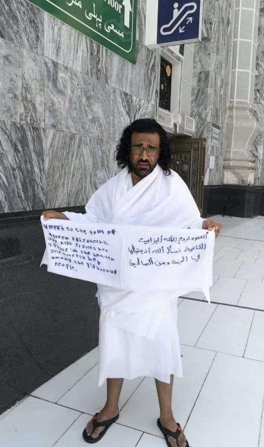 وفي مقطع الفيديو، ومدّته لا تتجاوز 20 ثانية، ظهر الرجل بملابس الإحرام حاملاً لافتة بيضاء كتب عليها بخط اليد “العمرة لروح الملكة إليزابيث الثانية، نسأل الله أن يتقبّلها في الجنّة ومن الصالحين”. وأضاف “نسأل الله أن يجعلها مع عباده الصالحين، نسأل الله أنّ يجعل روحها في الجنّة”.