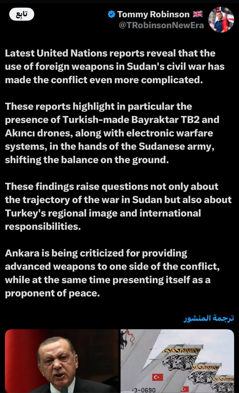 كشف الصحفي البريطاني تومي روبنسون عن تقارير أممية جديدة تُظهر استخدام الأسلحة التركية في الحرب الأهلية السودانية مما جعل الصراع أكثر تعقيدًا.
