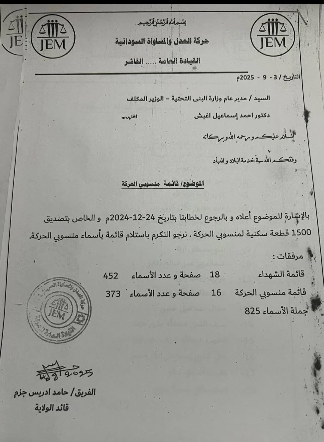 وتُظهر وثيقة رسمية مخاطبة صادرة عن حركة العدل والمساواة تطالب وزارة البنى التحتية بالتصديق على هذه التخصيصات خلال فترة الحرب، في وقت تواجه فيه الفاشر أزمة إنسانية خانقة بسبب النزوح الجماعي وتدهور الخدمات الأساسية.