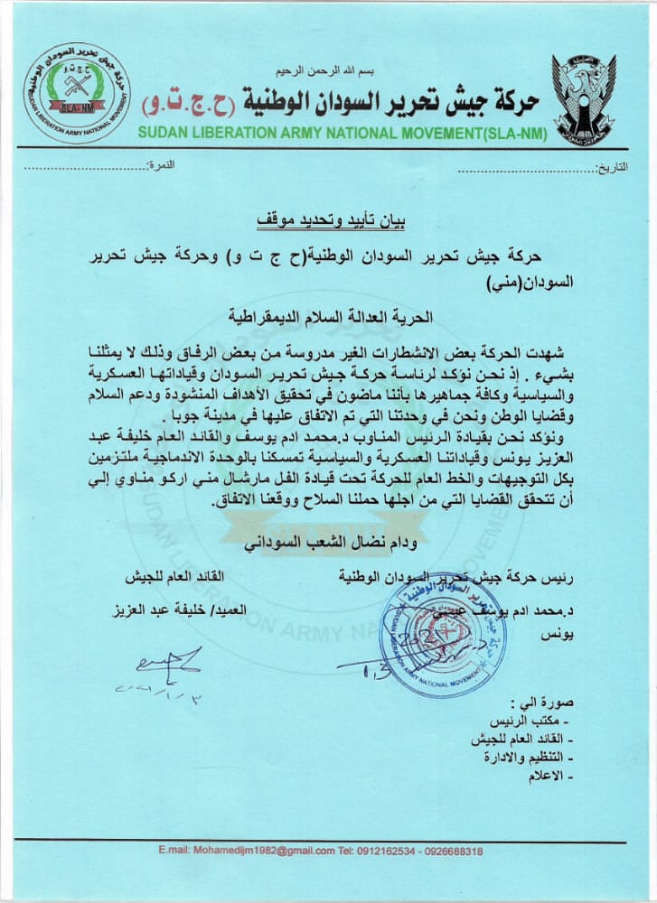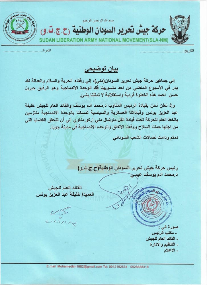 اعلنت حركة جيش تحرير السودان الوطنية (ج ح ت و) تمسكها بالوحدة الإندماجية التي تمت بينها وحركة جيش تحرير السودان جناح مني اركو مناوي ، في جوبا عاصمة دولة جنوب السودان قبل الإنخراط في عمليات التفاوض مع حكومة السودان . وكان رئيس الحركة جبريل حسن احمد قد اعلن في وقت سابق تنصله عن إتفاق الوحدة الإندماجية الذي تم مع حركة جيش تحرير السودان قيادة مناوي . ودعت قيادة حركة جيش تحرير السودان الوطنية الي إجتماع طارئ اعلنت فيه عزل رئيسها ، وتكليف د/ محمد ادم يوسف خلفاً له ، واعلنت تمسكها بالوحدة الإندماجية . وأصدرت الحركة بيانين ، الأول بيان توضيحي ، وصفت فيه أن ما بدر من رئيس الحركة السابق من فك الوحدة الإندماجية يعد خطوة وتصرف فردي لا يمثل الحركة . وفي بيان ثاني للتأييد وتحديد الموقف قالت الحركة : أن الإنشطارات الغير مدروسة والقرارات الفردية لا تمثل الحركة في شئ ، مؤكدة لرئاسة حركة جيش تحرير السودان وقيادتها العسكرية والسياسية وكافة جماهيرها بأنها ماضية في تحقيق الأهداف المنشودة ودعم السلام وقضايا الوطن وأنها ما زالت في الوحدة التي تم الإتفاق عليها في مدينة جوبا . وبحسب البيان أن الحركة تؤكد تمسكها بالوحدة الإندماجية والإلتزام بكل التوجيهات والخط العام للحركة تحت قيادة مني اركو مناوي ، الي أن تتحقق القضايا التي حملوا من أجلها السلاح ووقعوا علي إتفاق السلام .