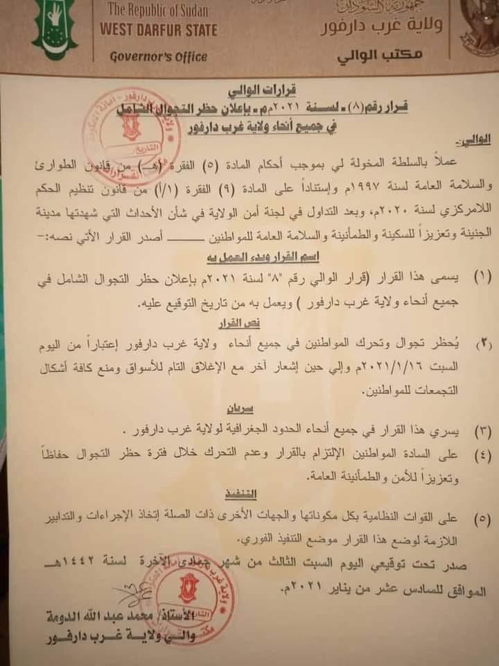 أصدر الاستاذ محمد عبدالله الدومة والي غرب دارفور قرارا فوض بموجبه القوات النظامية باستعمال القوة لحسم المتفلتين بالولاية ويأتي ذلك على خلفية احداث العنف التي شهدتها محليه الجنينة (منطقة كريندق) إثر مشاجرة بين شخصين خلفت وراءها اثنين من القتلى وجرح آخرين وحرق لبعض المنازل المبنية بالمواد المحلية.
